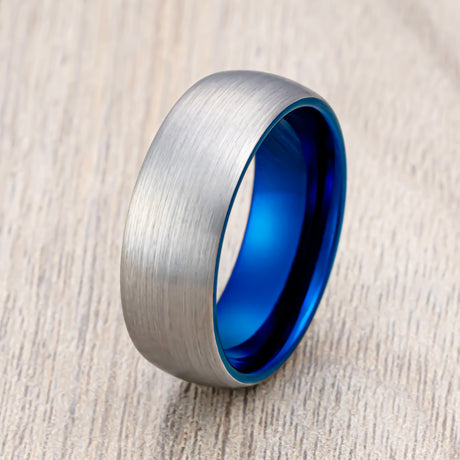 8mm Blue Brushed Dome Tungsten Wedding Band with Polished Edges