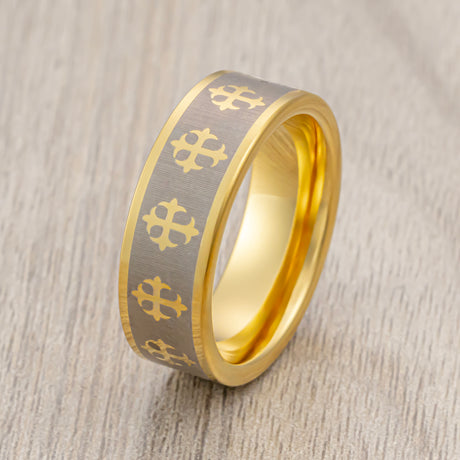 8mm Gold Tungsten Wedding Ring Laser Engraved Crosses Pipe Cut Ring
