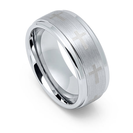 9mm Silver Tungsten Carbide Wedding Band W/ Engraved Crosses on Brushed Center